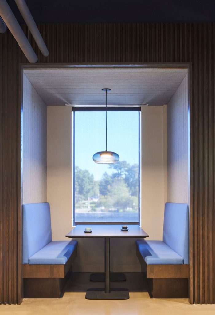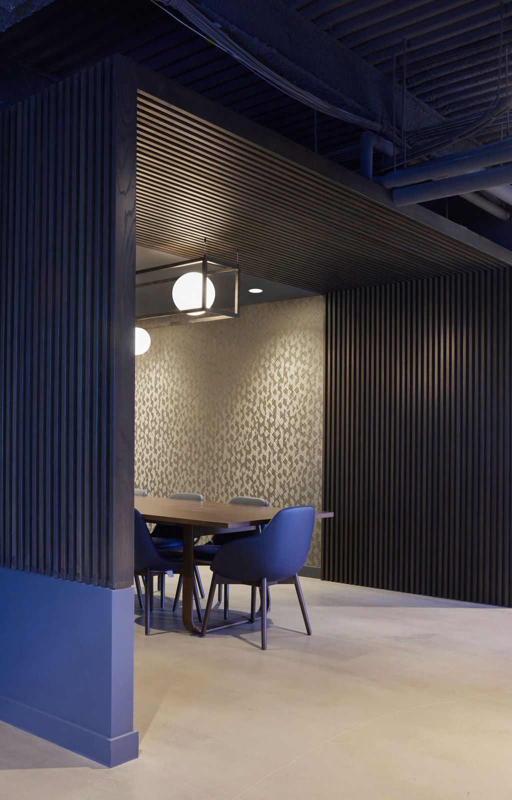 As one of the largest importers/exporters of refined sugar to and from North America, CSC Sugar was looking to renovate 10,000 square feet of space on the Saugatuck River in Westport, CT. Built in 2022, our design intention was modern, industrial black metal meets rich, dark wood. CSC’s wish list included the energetic vibe of a game room and fitness center, and of course, coffee! A well-appointed coffee bar was a priority, complete with built-in banquettes for enjoying the one-of-a-kind river views. A new balcony addition, right off the open pantry, is near completion – it features a folding glass wall that opens up to views of the Saugatuck River.